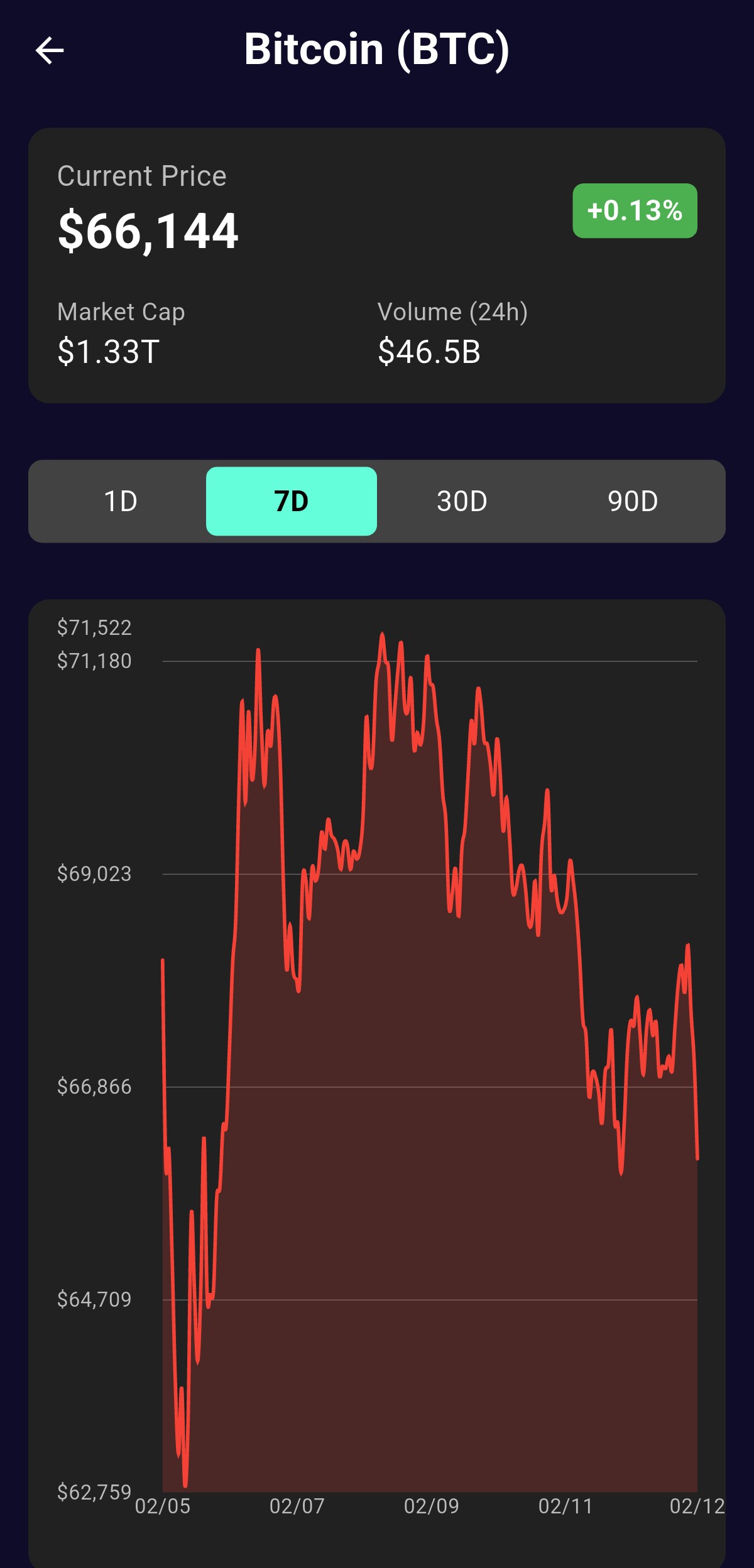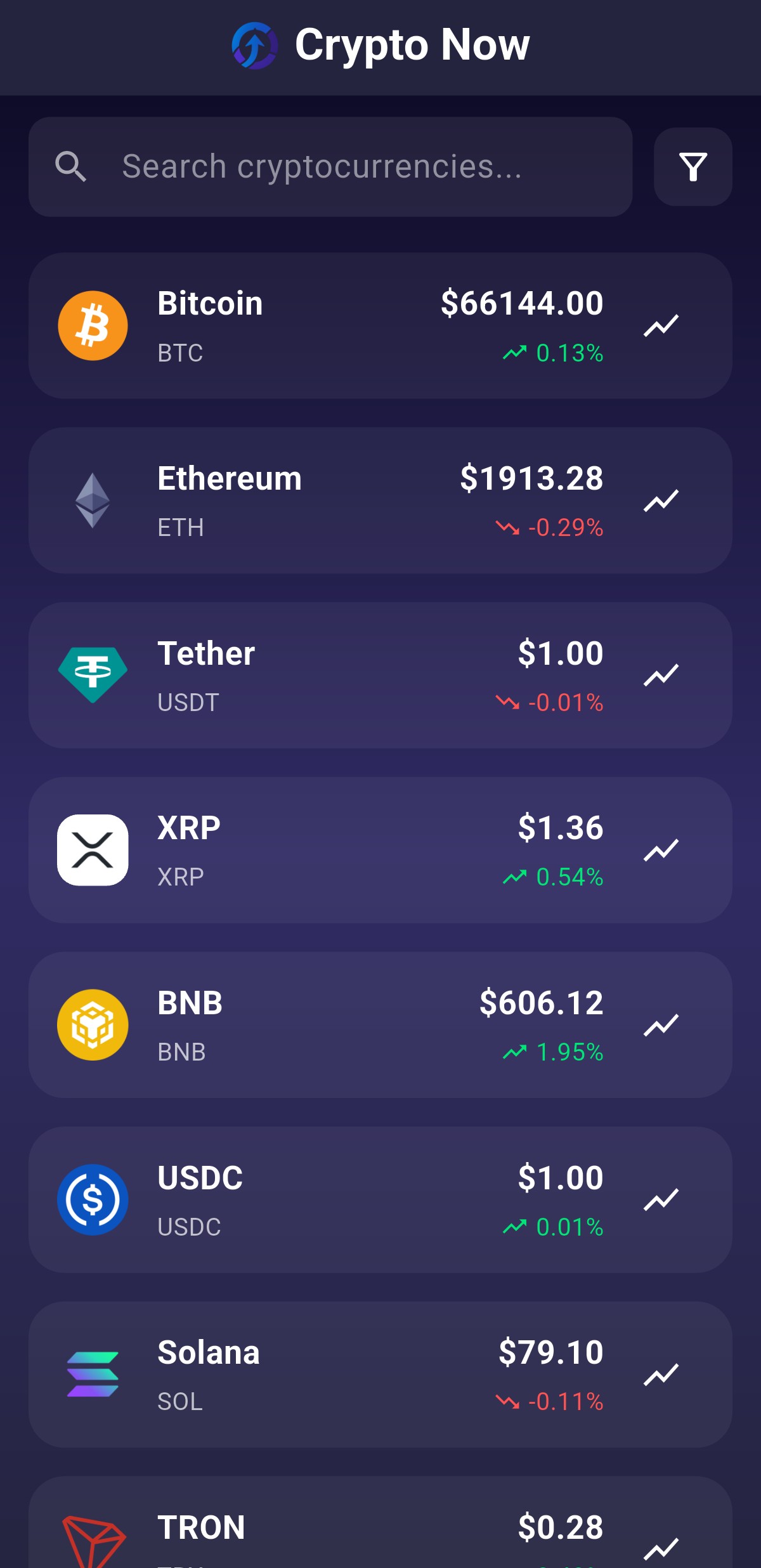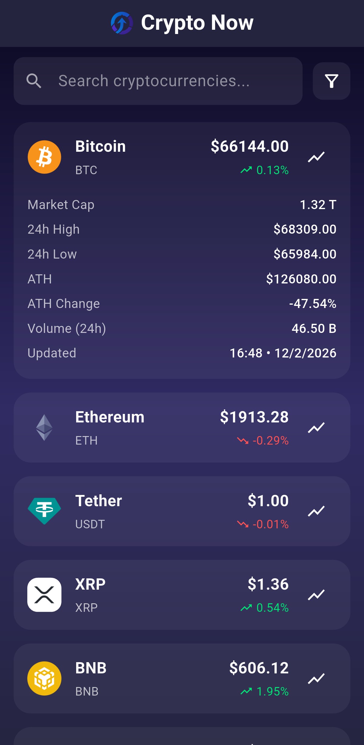 Crypto Now is a sleek, lightweight mobile application designed for crypto enthusiasts who need real-time market data on the go. It provides up-to-the-minute price tracking for thousands of cryptocurrencies, detailed historical charts (daily, weekly, monthly, 90-day), and custom push notifications so you never miss a market movement.