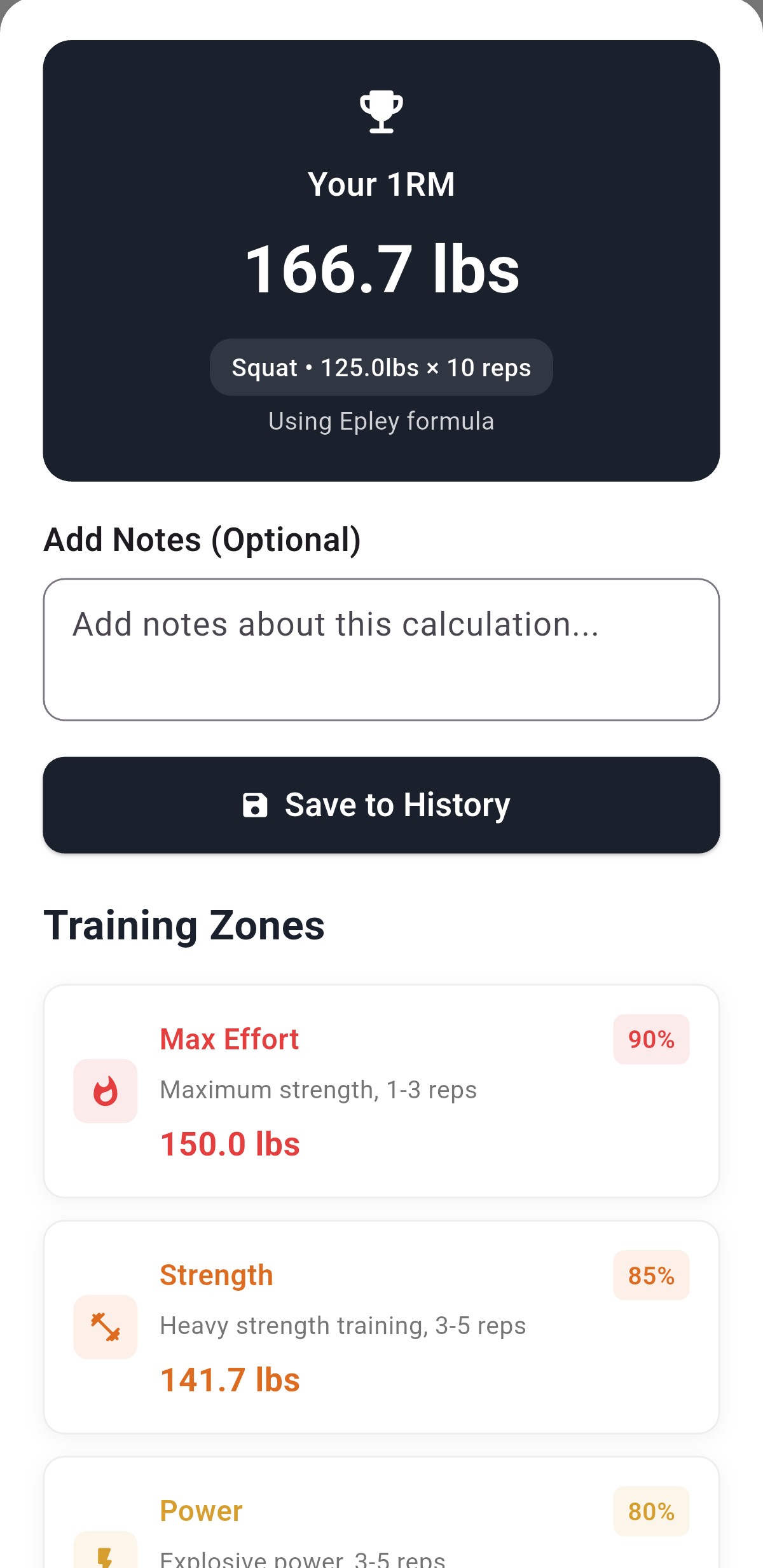 Calculate 1RM using Brrzycki, Epley, Lander, and more.